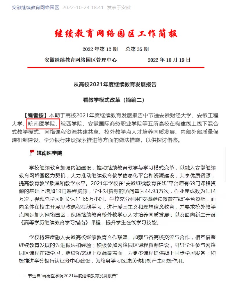 近日,从安徽继续教育网络园区获悉,公司高等学历继续教育在教学模式改革、网络课程资源共建、人才培养等方面的经验和做法被选编入安徽继续教育网络园区工作简报,获得广泛关注,并为省内其他高校继续公司产品改革起到示范作用。