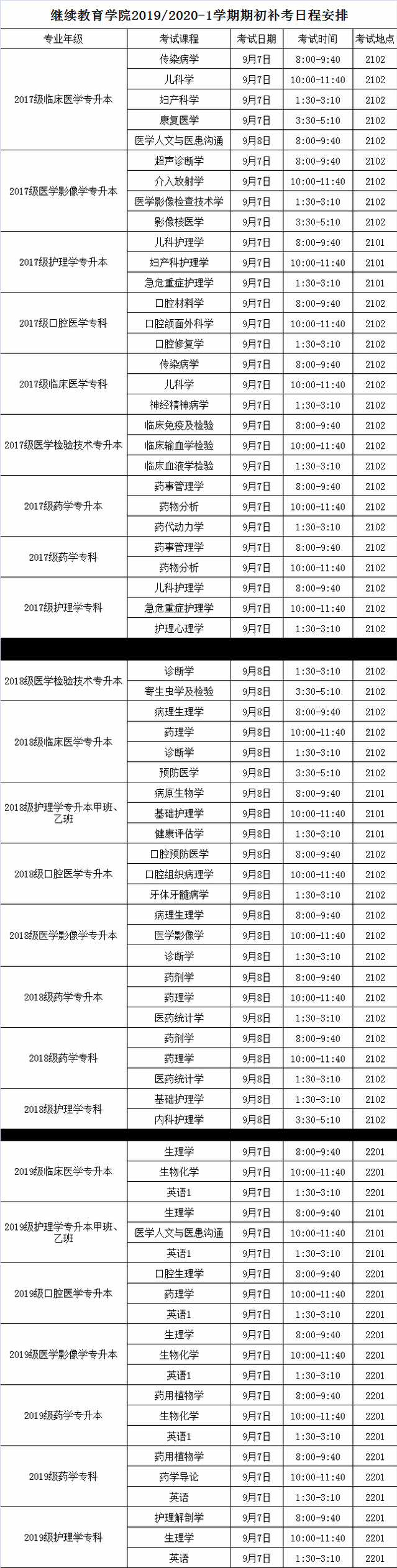 m88官网2019/2020-1学期期初补考日程安排