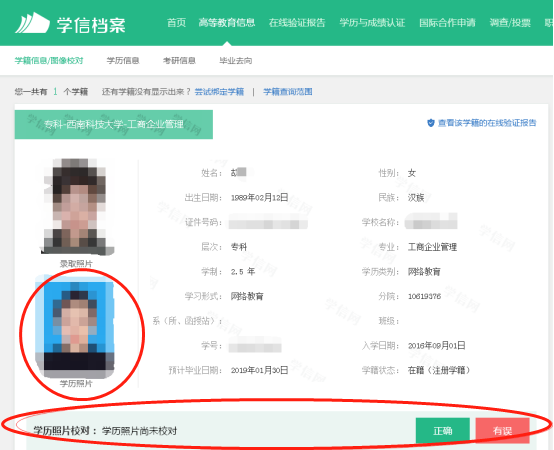 4、核对照片及学籍信息,无误后点“正确”,若有问题请及时反馈给辅导员。